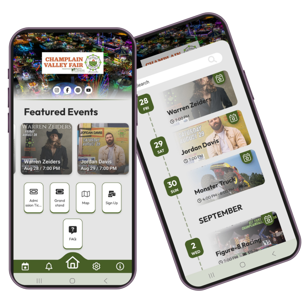 Stay informed on the summer concert series event of the year at the Champlain Valley Fair! Keep up to date on concert announcements, contests, and daily fair schedules, all in the palm of your hand.